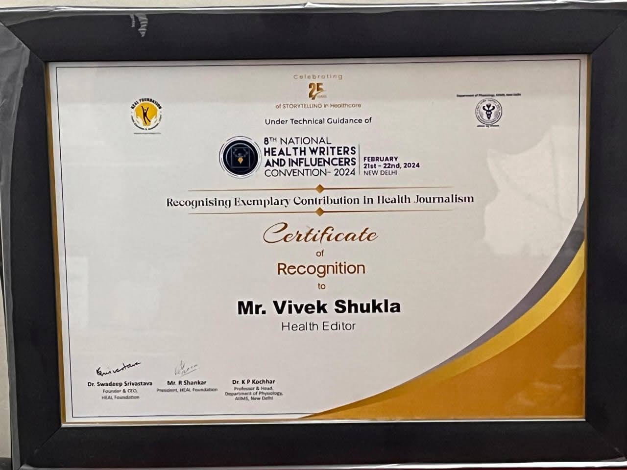 AIIMS New Delhi and HEAL Foundation awarded Vivek Shukla on 21 Feb.2024